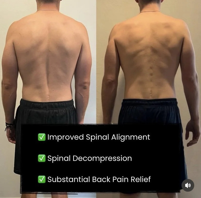 Side-by-side comparison of a man's back before and after spinal treatment. The left shows an uneven posture, while the right shows improved spinal alignment. Text overlay highlights benefits such as improved spinal alignment, spinal decompression, and substantial back pain relief.