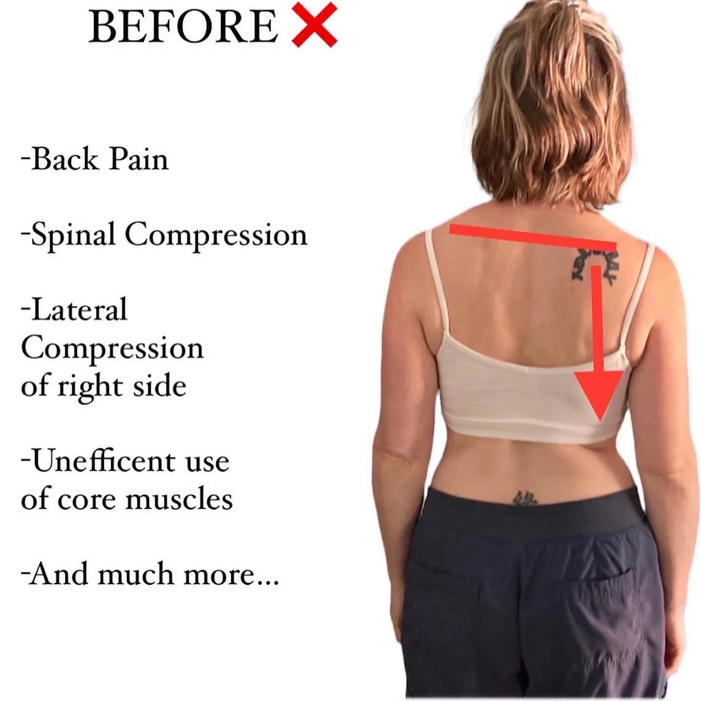 Before image showing a shirtless man with arrows pointing down the arm and across the waist, accompanied by a list of issues including constant back pain, spinal compression, lateral shift of pelvis, muscles in spasm, inefficient core engagement, and more.