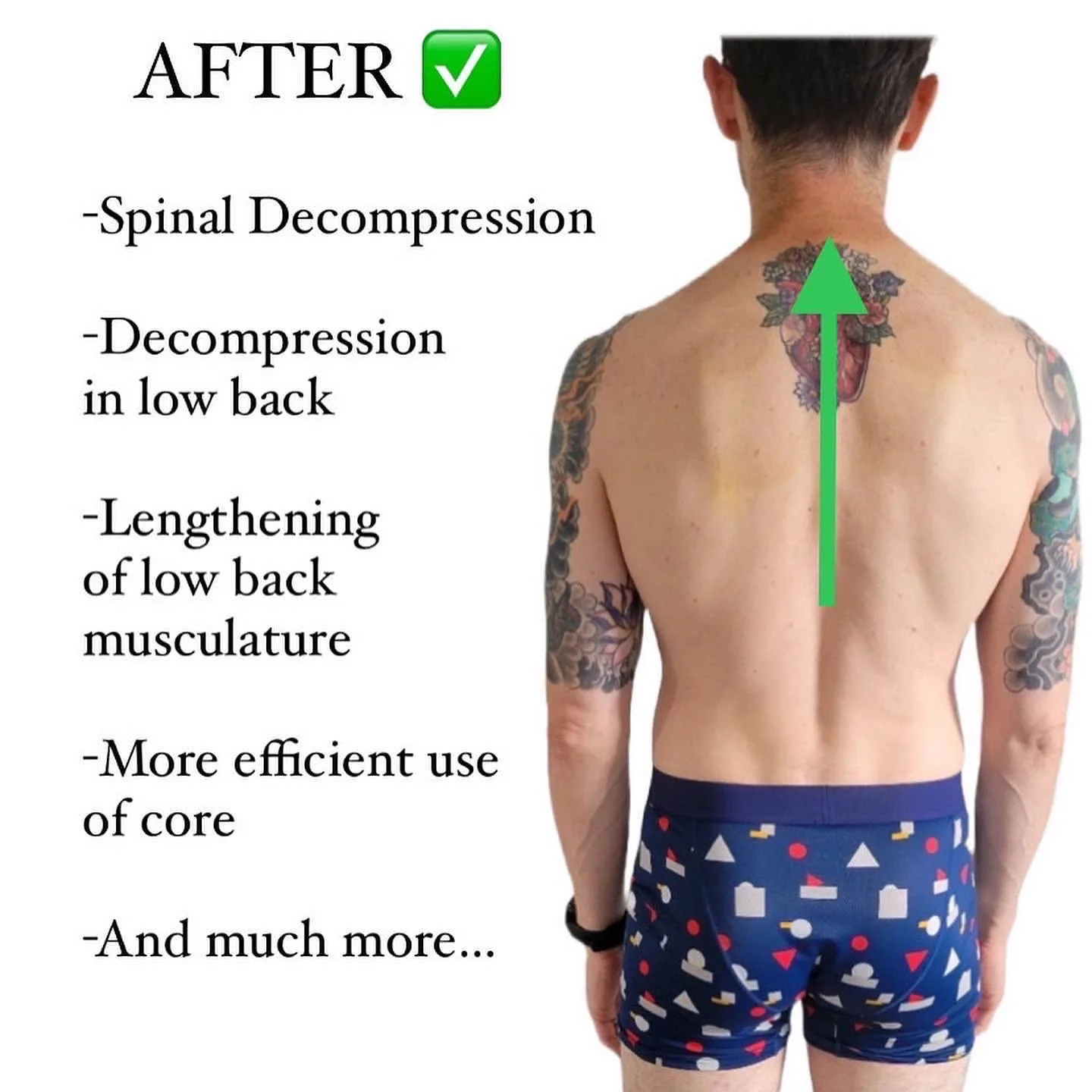 A back view of a tattooed man with an arrow pointing upwards on his back, indicating improvements after spinal decompression and back muscle lengthening.