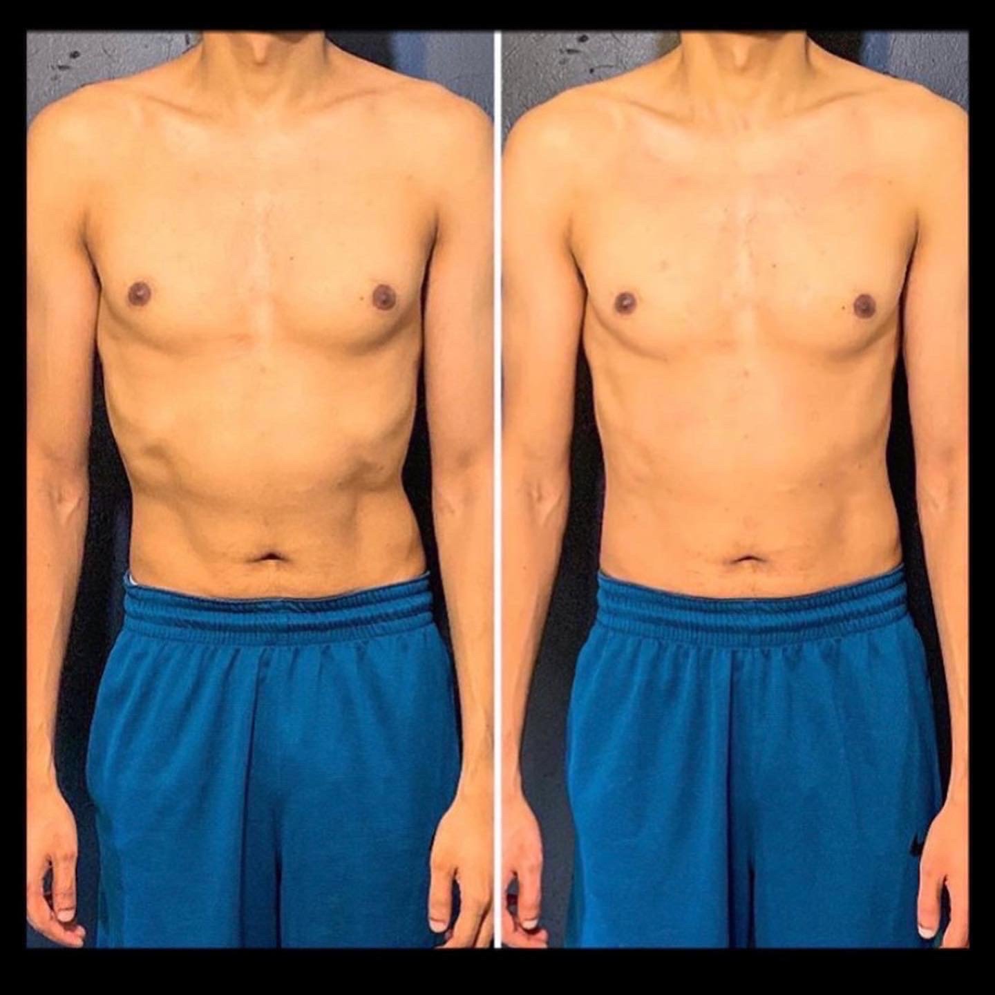Side-by-side comparison of a shirtless man before and after fitness transformation, showing increased muscle definition and reduced body fat.
